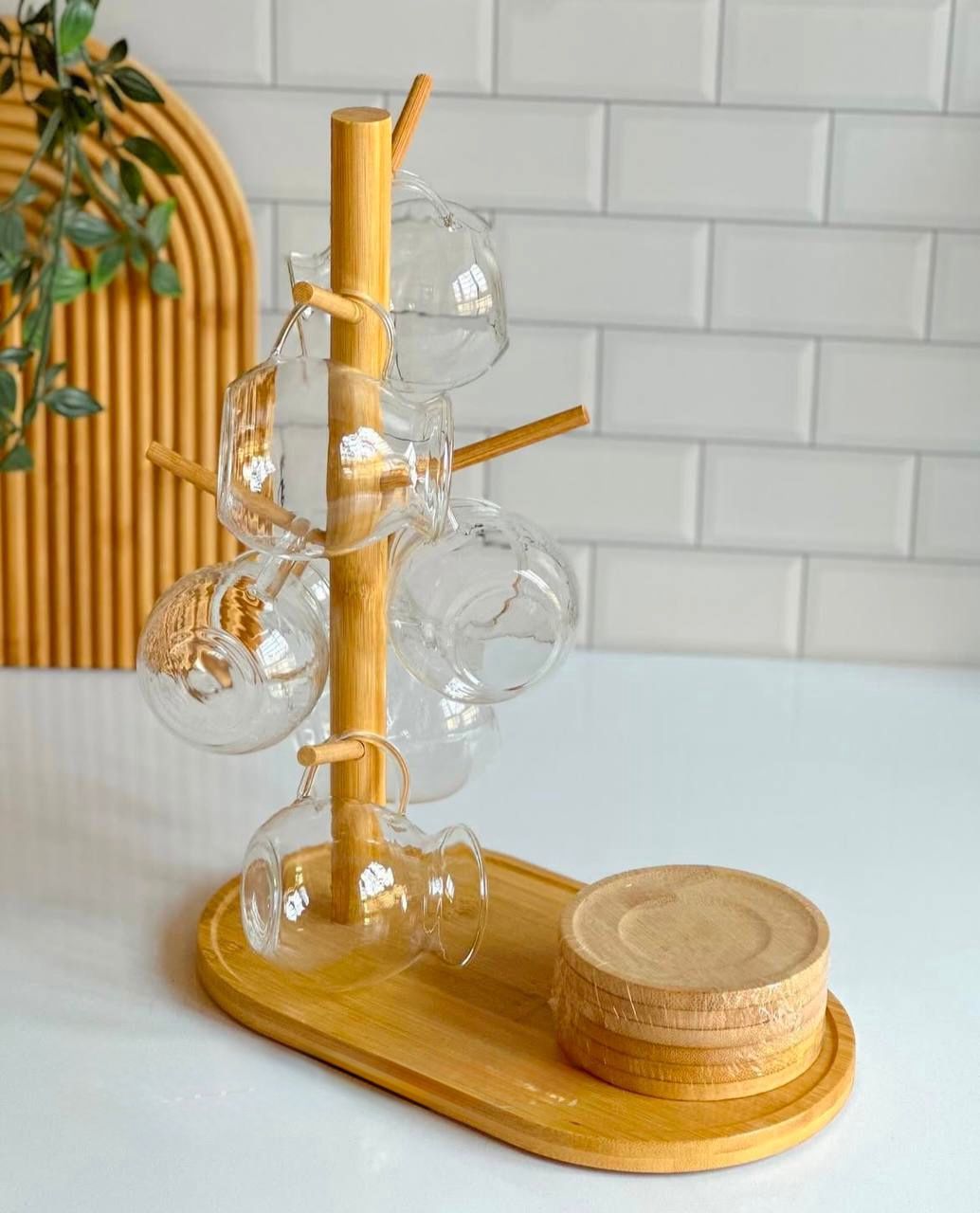 حامل مجات مزود ب 6 هوكات خشب + صينية خشب بامبو